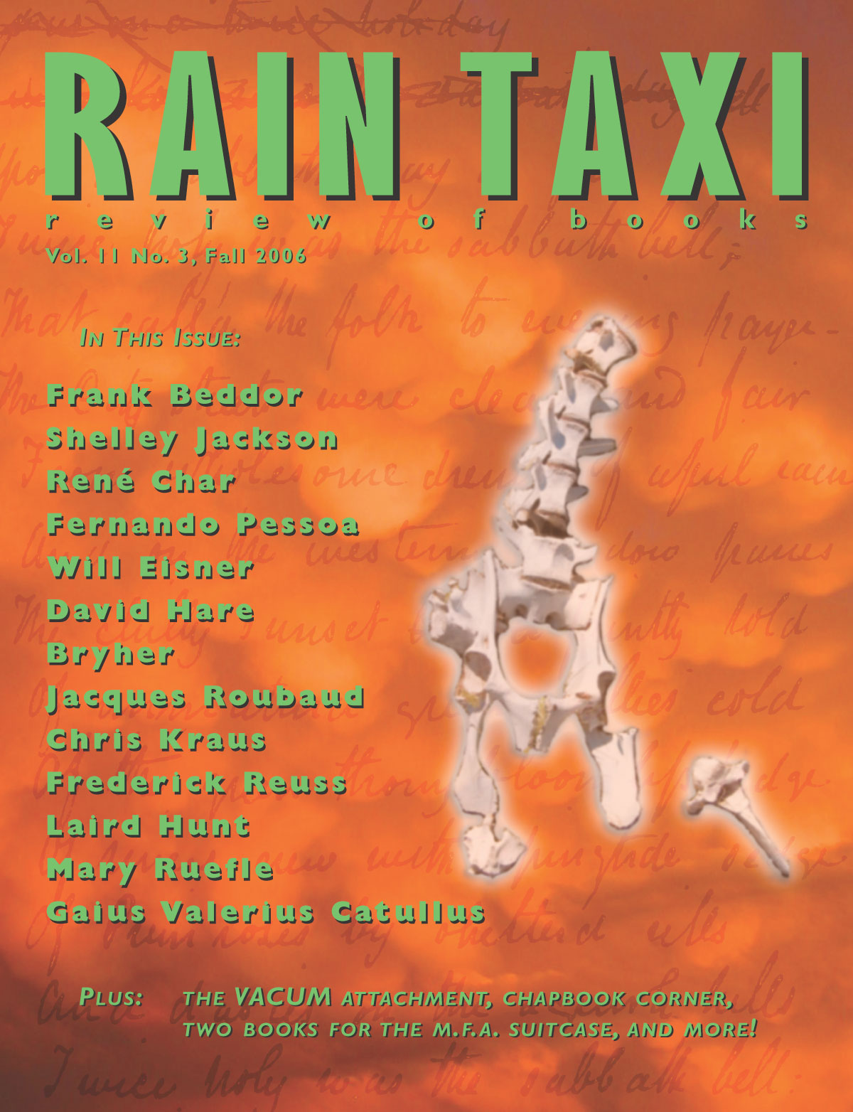 Vol. 11, No.3, Fall 2006 (#43) Frank Beddor, Rene Char, Bryher, Laird Hunt, VACUM Attachment, Shelley Jackson, Chris Kraus, Fernando Pessoa, and more... purchase now