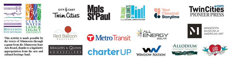 Thanks to our 2013 volunteers and sponsors: Minnesota State Arts Board, Metropolitan Regional Arts Council, MELSA, Target Foundation, and TCF Foundation; Media sponsors: MSP Magazine, City Pages, Minnesota Public Radio; booksellers: Magers & Quinn Booksellers, Common Good Books, and Red Balloon Bookshop.