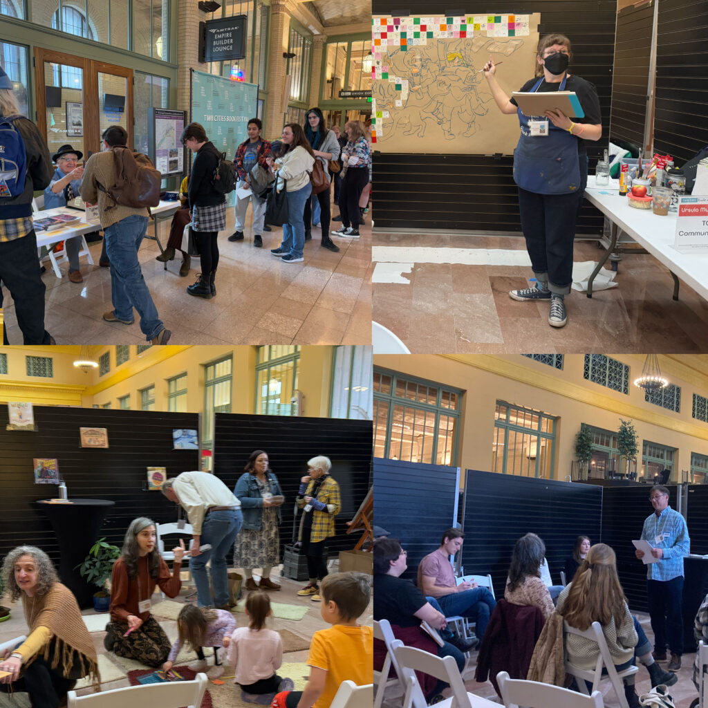 Over 140 exhibitors turned Union Depot’s Waiting Room into a Book Fair extraordinaire, and attendees filled the aisles all day perusing books, magazines, and the offerings of all kinds of literary or literature-adjacent organizations. Rain Taxi’s annual Used Book & Record Sale fundraiser awaited folks at the end of the hall, and books and LPs flew off the tables all day long! At the front of the hall, festival-goers found a welcoming hub at the Rain Taxi Booth, which hosted two special features: free 5–10 minute Literary Tarot Readings with Syr Beker, author of What A Fish Looks Like, and Writers for Democratic Action–MN, who helped visitors generate hope through language by adding lines to a community poem, writing postcards to legislators, and gathering resources designed to make their voices heard.